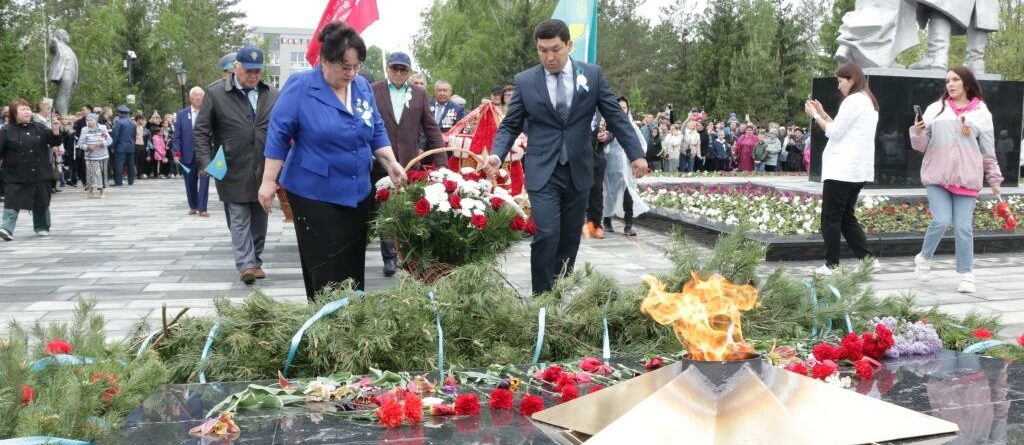В честь 80-летней годовщины Победы в Великой Отечественной войне на Площади Доблести с самого утра собрались гости и жители города Тобыл, где с участием акима Костанайского района Олжаса Нургалиева состоялась церемония возложения цветов к Вечному огню.