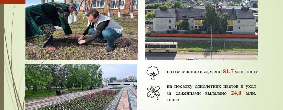 В текущем году на озеленение выделено 81,7 млн тенге. За счёт этих средств уже высажено 2200 пирамидальных тополей, а в период осенней посадки планируется дополнительно посадить ещё 4500 деревьев. Также 24 млн тенге направлено на посадку однолетних цветов и уход за саженцами.