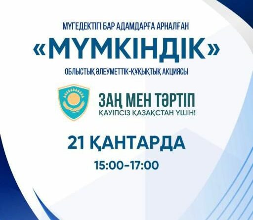 2026 жылғы 21 қаңтарда сағат 15:00-ден бастап Қостанай облысында «Заң мен тәртіп» идеологиясын іске асыру шеңберінде өткізілетін «Мүмкіндік» мүмкіндігі шектеулі жандарға арналған облыстық әлеуметтік-құқықтық акция өтеді.