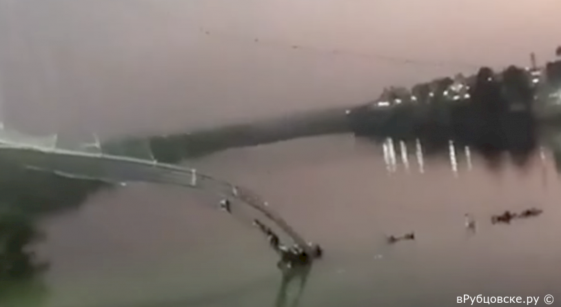 На кадрах телеканала Reuters видно, как десятки людей цепляются за тросы и искривленные остатки моста через реку Мачху в городе Морби, пока спасатели пытаются их спасти. Некоторые взобрались на сломанную конструкцию, чтобы попытаться добраться до берега, в то время как другие плывут в безопасное место. По словам очевидцев, несколько детей упали в реку, они утонули или их унесло течением.