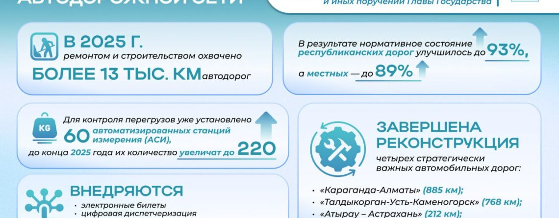 Из них по 7 тыс. км производится средний ремонт. Охвачены такие участки автодорог как: «Жезказган – Петропавловск», «Мукыр – Кульсары», «Уральск – Атырау», и др. Начато строительство автодороги Центр-Запад, а также участков «Актобе – Улгайсын», «Караганда – Жезказган», обходов Сарыагаша, Рудного и Шымкента. Завершается дорога «Калбатау – Майкапшагай».