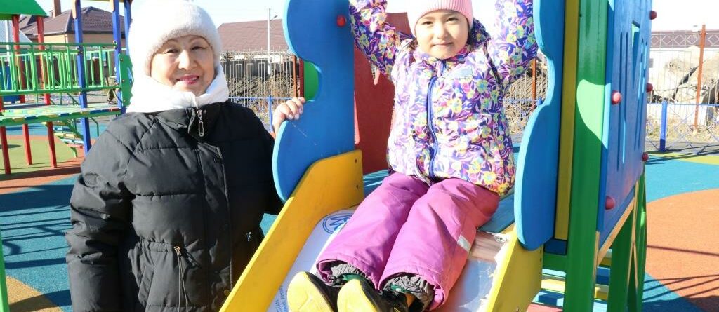 Улбала Ансабаева со своими четырьями внуками проводит на данной детской игровой площадке все свое свободное время. Теперь это их любимое место.