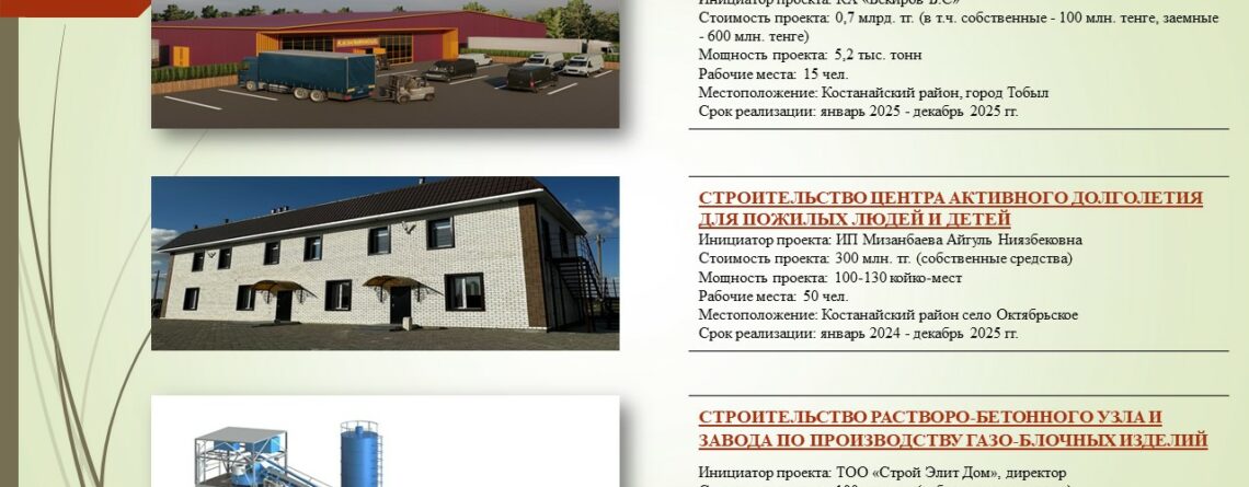 - Растворобетонный узел и завод по производству газоблочных изделий мощностью 30 кубометров бетона в час с созданием 30 рабочих мест. Реализатор – ТОО «СтройЭлитДом». Стоимость проекта составляет 100 млн тенге (собственные средства).