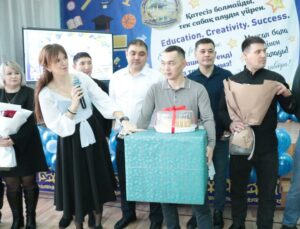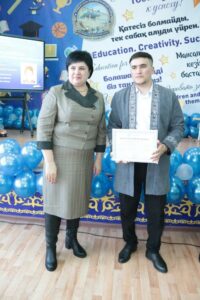 Азат Утигенович вручил сертификат на сумму 200 тысяч тенге, а также грамоты преподавателю- организатору НВиТП Мурату Атымтаеву, помощнику воспитателя Кенжегуль Кульмухамбетовой и медработнику школы Бакыткуль Жанбосыновой.