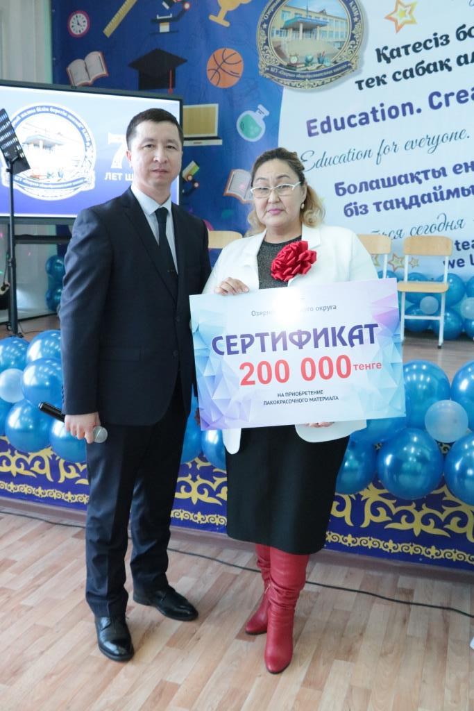 Азат Утигенович вручил сертификат на сумму 200 тысяч тенге, а также грамоты преподавателю- организатору НВиТП Мурату Атымтаеву, помощнику воспитателя Кенжегуль Кульмухамбетовой и медработнику школы Бакыткуль Жанбосыновой.