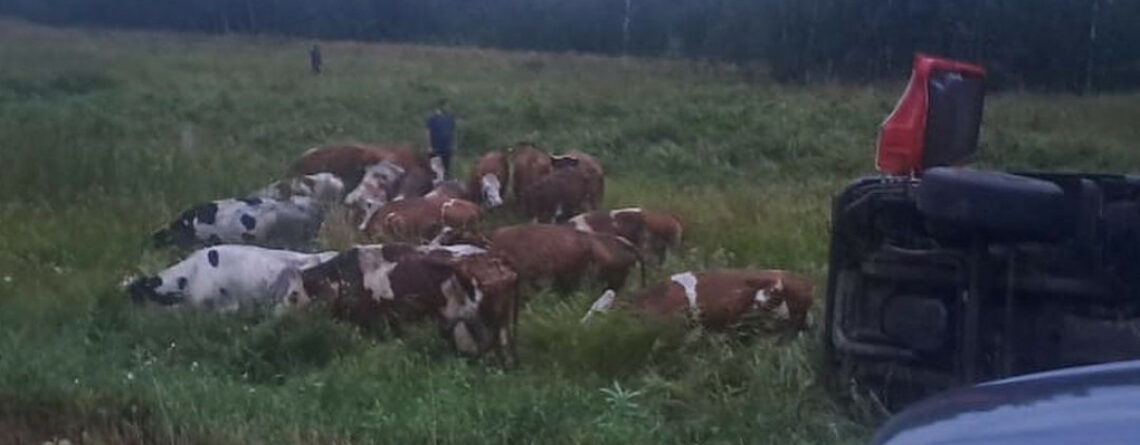 Вечером 21 августа на 26 километре дороги Костанай – Мамлютка опрокинулась фура, которая перевозила коров из Северо-Казахстанской области на мясокомбинат в селе Заречное.