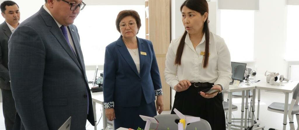 Перед началом мероприятия гостю Малику Отарбаеву провели экскурсию по комфортной школе с госязыком обучения, рассчитанной на 900 мест. Напомним, это первая в Костанайской области школа, которая была построена в рамках национального проекта в современном формате. Это трехэтажное здание с новейшим материально-техническим оборудованием. Малику Отарбаеву продемонстрировали предметные кабинеты по физике, химии, биологии с учебными лабораториями, кабинеты робототехники и компьютерные классы, STEM-лаборатории и т.д.